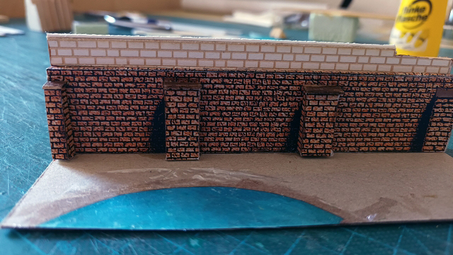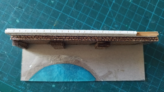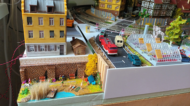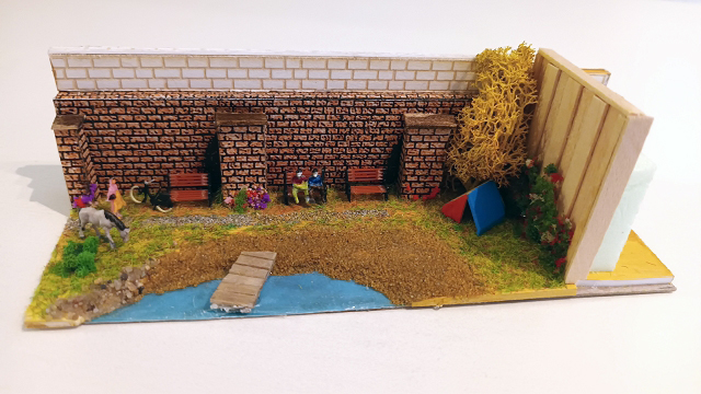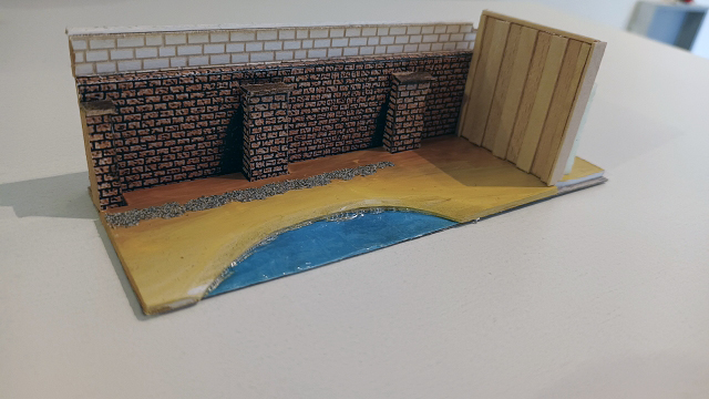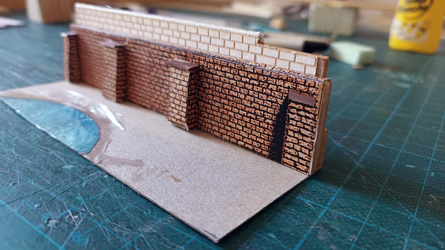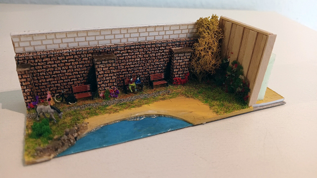 Die Mauer aus Styrodur wurde mit Ziegelsteinmuster aus dem Laser-Kopierer beklebt. Die darüberliegende Steinmauer wurde mit einem Laser-Cutter graviert. Der dargestellte See ist ein blau grün verlaufender Papierbogen der mit einer dünnen Klarsichtfolie überdeckt wurde (etwas faltig und nicht ganz glatt).
