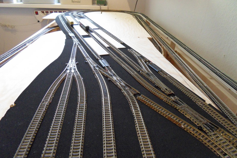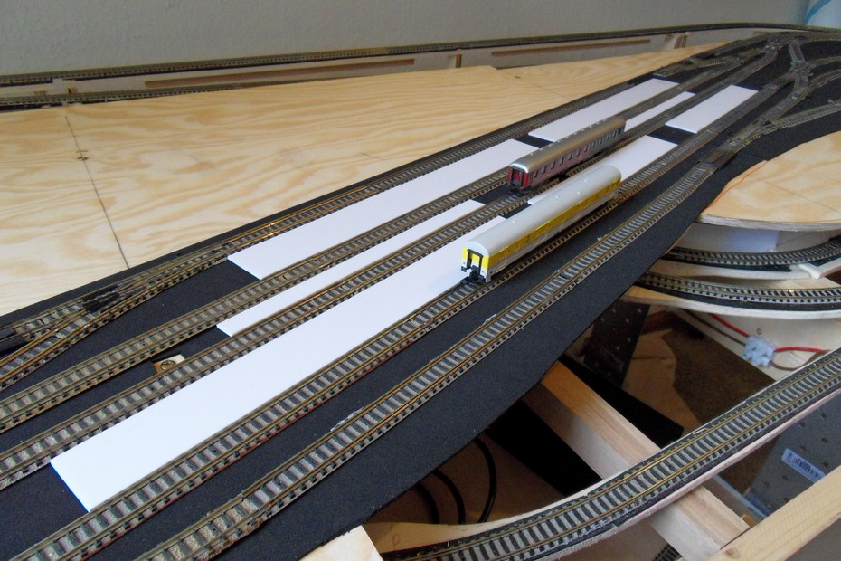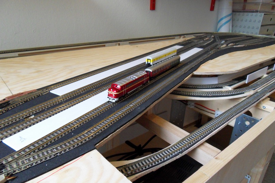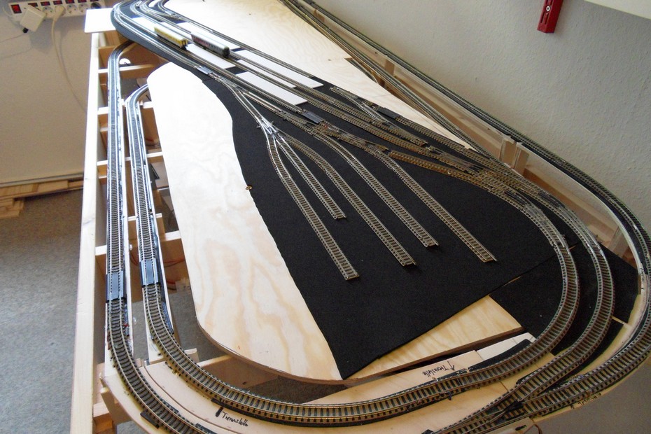 Auf das Grundgerüst wurden die Stützen für die Bahnhofsplatte geklebt. Darauf habe ich die Bahnhofsplatte aus 6 mm Sperrholz geschraubt. Die Dämmung aus 2 mm Zellkautschuk folgte als nächstes.Der Gleisplan wurde übertragen und die Gleise vor der Fixierung zur Probe ausgelegt.