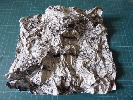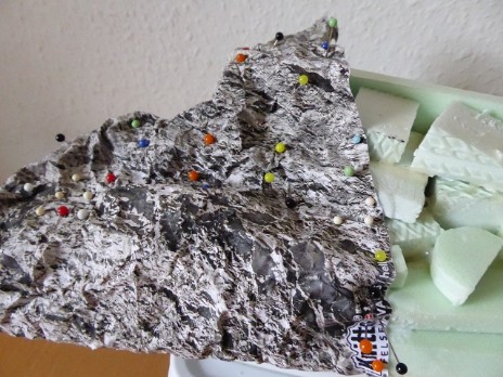 Durch mehrmaliges knittern des Ppaierbogens wird die Felsenstruktur im Detail immer feiner. Das so erziehlte Ergebnis habe ich mit Ponal und ganz vielen Stecknadeln dann auf das Styrodurmodul aufgelegt und festgesteckt. Nach aushärten des Klebers die Stecknadeln wieder entfernt.