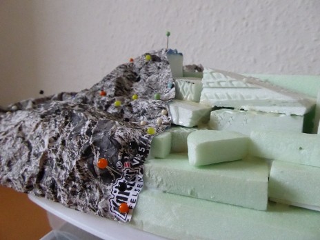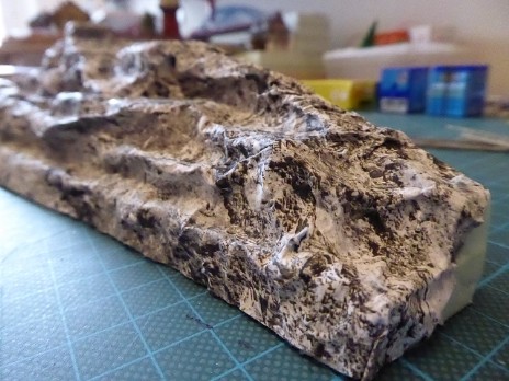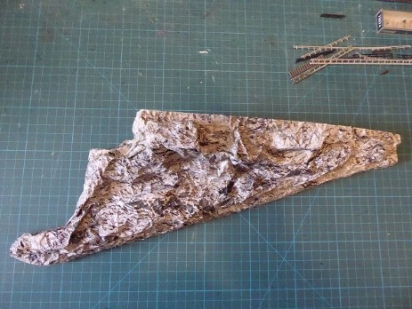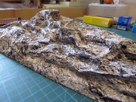 Eine Styrodur-Platte (auf das Maß zurechtgeschnitten) und einige Styrodur-Reste dienten zur Modellierung des Berges. Fixiert wurden die Teile mit Ponal und diversen Stecknadeln. Für die Felsenlandschaft habe ich mich für die Papier-Knitterfelsen der Fa. Atelier-Dietrich entschieden. Durch knittern des Papierbogens erreicht man eine sehr gute realistisch wirkende Felsstruktur. Es gibt sie in verschiedenen Steinvariationen, ich habe mich für die Kalksteinvariante 5 hell entschieden.