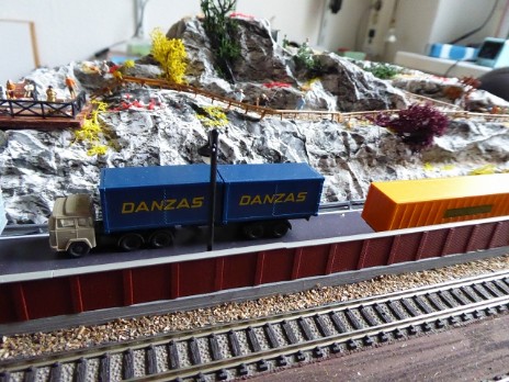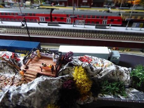 Vor dem Bahnhof Jungthal soll ein kleiner Bergabschnitt mit einem Wanderweg zu einer Aussichtsplattform entstehen. Die Preiserlein blicken dann auf das Bahnhofsgeländer und nach links zur Spedition S.Wittke.