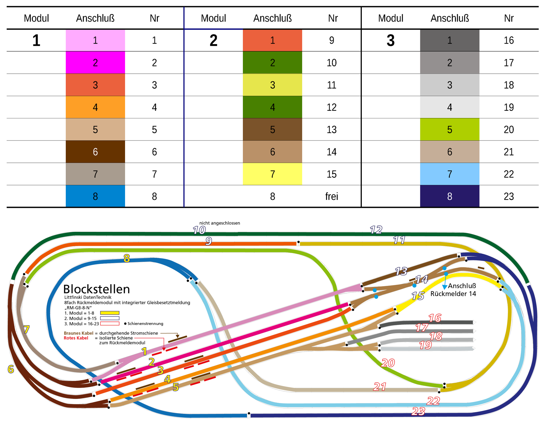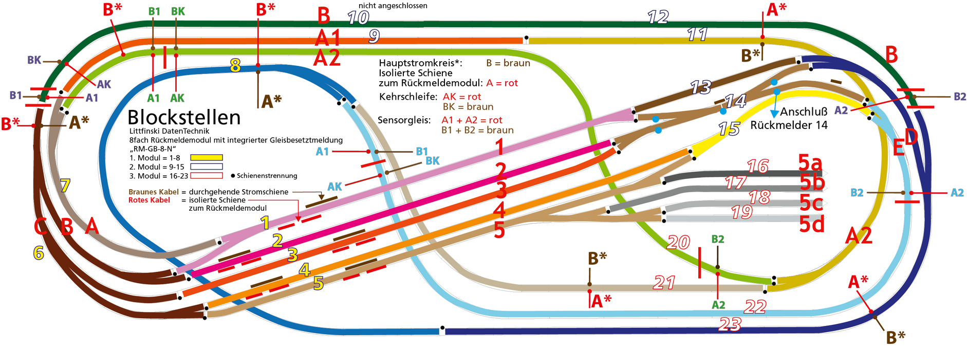 Auf der Anlage habe ich 23 Blockstellen in 3 Module aufgeteilt. Die Länge richtete sich nach dem kürzesten Bahnsteiggleis. Dies war wie auf der Zeichnung zu sehen Gleis 1. Die Modulnumerierung ist auf dem Gleisplan mit unterschiedlichen Farben dargestellt.