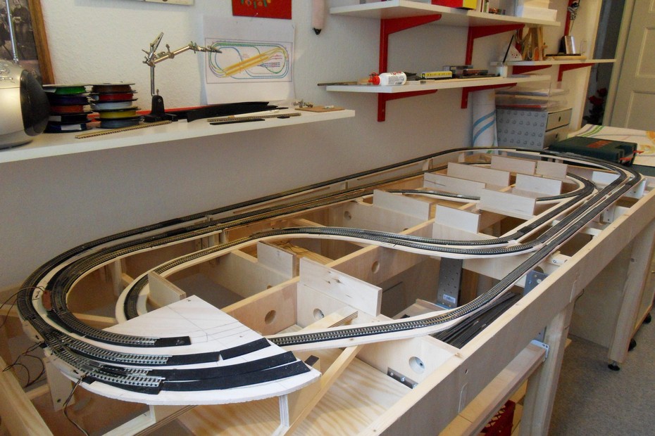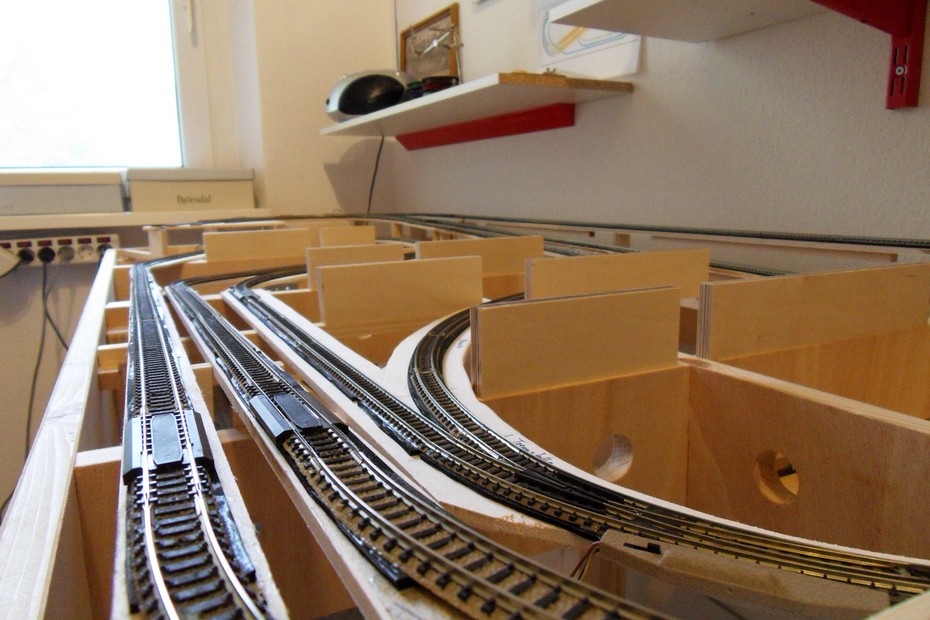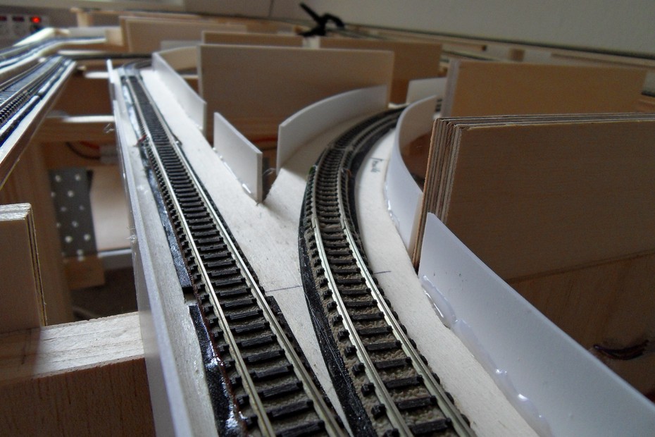 Die Weichen und Gleise wurden ebenfalls mit dem Flexleim auf den Zellkautschuk-Streifen aufgeklebt.