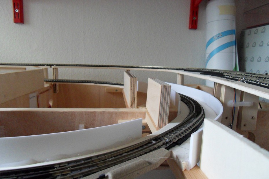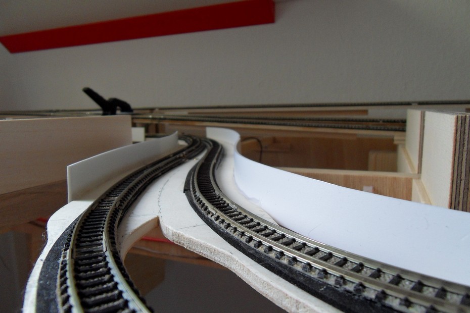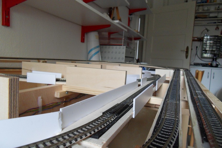 Zum seitlichen Schutz gegen Abstürze – bei Entgleisung in der Ebene -1 – habe ich seitlich 2mm hohe Forex-Streifen mit der Klebepistole angeklebt.