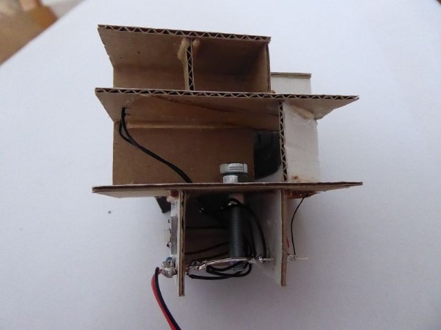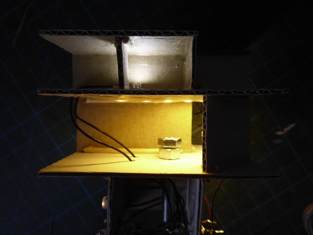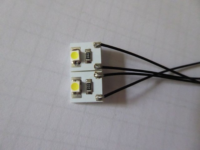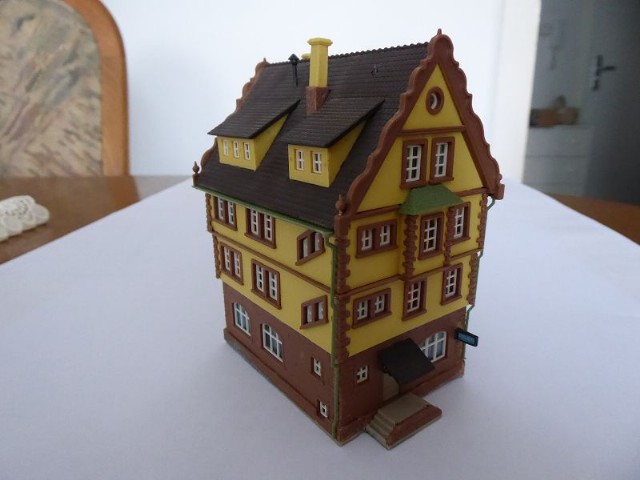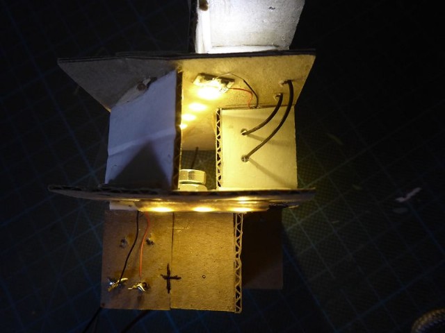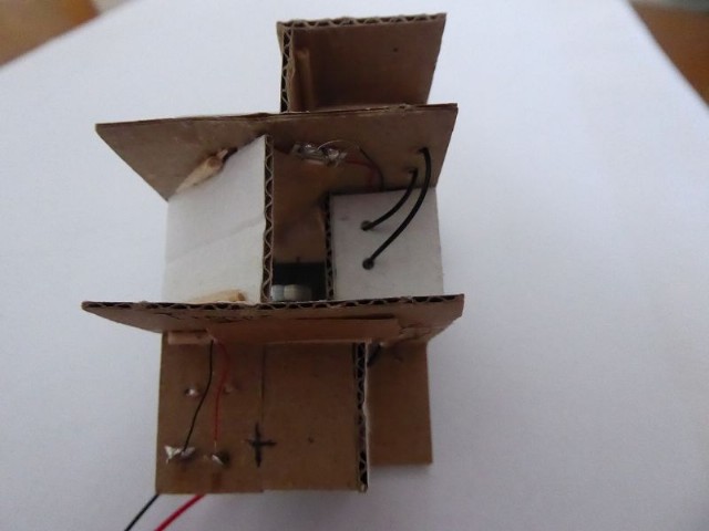 Das Innenleben des Modellhauses habe ich aus Karton erstellt. In die einzelnen Stockwerke wurden Zwischenwände eingezogen, so daß es möglich ist, einzelne Fenster zu hinterleuchten. In die Stockwerke wurden unterschiedliche LEDs eingeklebt. Zusätzlich wurden einige LEDs mit ein- oder mehrlagigem Backofenpapier überklebt. Das ergibt dann unterschiedlich helle und farbige Fensterbeleuchtungen (Zusätzlich zu den verschiedenen Fenstergardinen). Vor dem Miniaturstecker wurde dann der 47 Ohm-Widerstand angelötet. Als alles fertig war, wurden die kompletten Stockwerksebenen in das Haus eingesetzt, auf der Forexplatte angeschlossen und bei Dunkelheit getestet. Hier waren dann doch noch einige Fenster in der Helligkeit zu ändern. Zum Schluß wird das Modellhaus mit Fixogum-Kleber (fest und/oder lösbar) auf der Forexplatte fixiert.