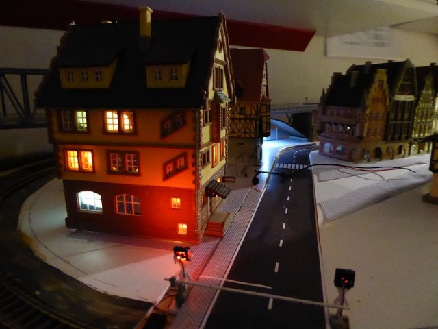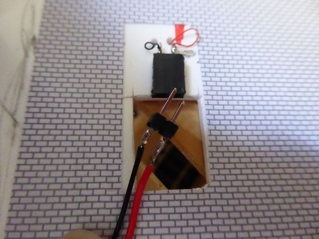 Alle Stadthäuser stehen auf einer 3mm Forex-Platte. Diese hat auf der Rückseite aufgeklebte Kupferleitbahnen, die an die 12 V Ringleitung angeschlossen sind. Oben auf der Forex-Platte ist für jedes Haus ein Miniatur-Stecker aufgeklebt. Hier wird die Stromversorgung für das jeweilige Haus angeschlossen. Somit kann jedes einzelne Haus abgenommen und repariert/verschönert werden.