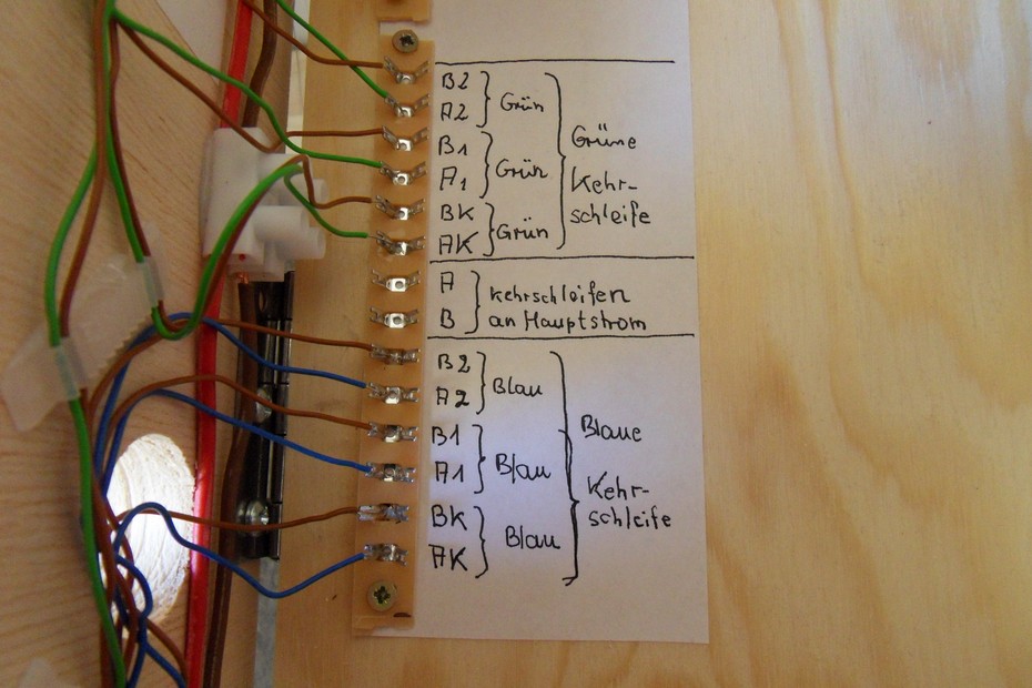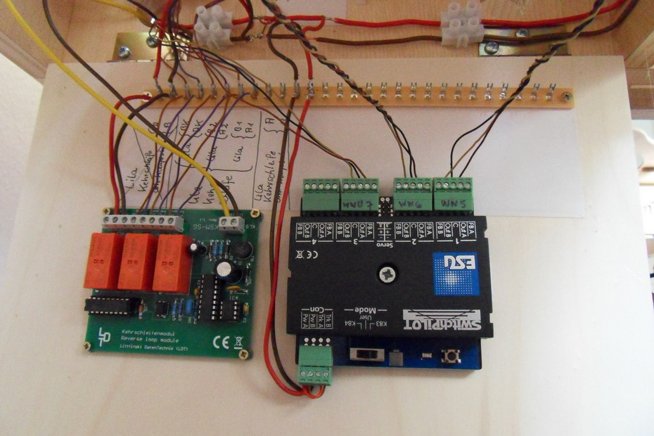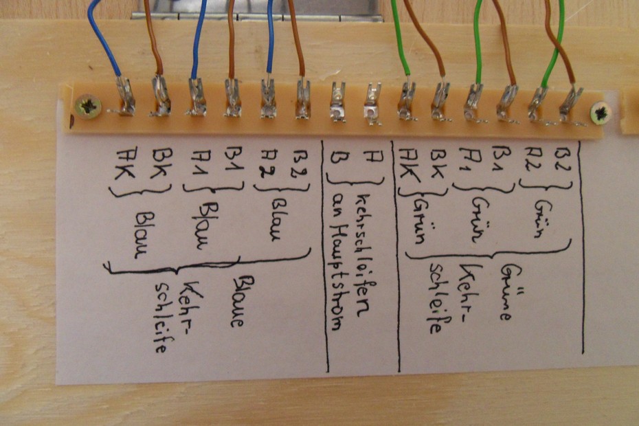 Hier sieht man die Verlegung der Anschlußkabel für die Kehrschleifenmodule.An die gegenüberliegende Seite der Lötleistenstifte erfolgt später der Anschluß des Kehrschleifenmoduls.Die farbigen Kabel entsprechen den Farben der Gleisabschnitte.