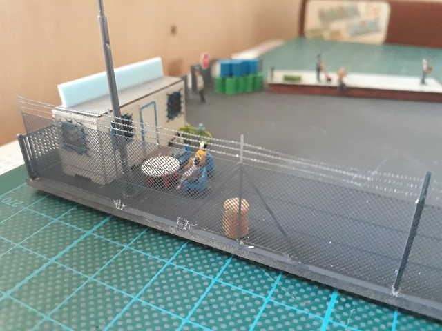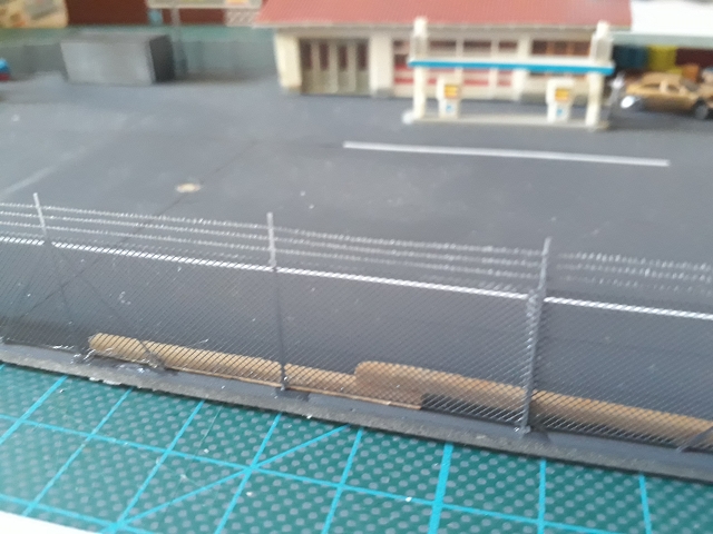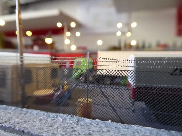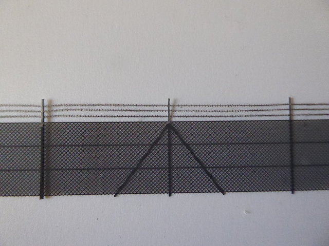 An der seitlichen Begrenzung zur Sandsteinmauer wurde aus sicherheitstechnischen Gründen ein Stacheldrahtzaun (https://www.ndetail.de/) installiert. Dieser ist ein Messingbausatz, der mit der Airbrushpistole beidseitig grau eingefärbt wurde. Der Stacheldraht mit Silberfarbe übermalt.