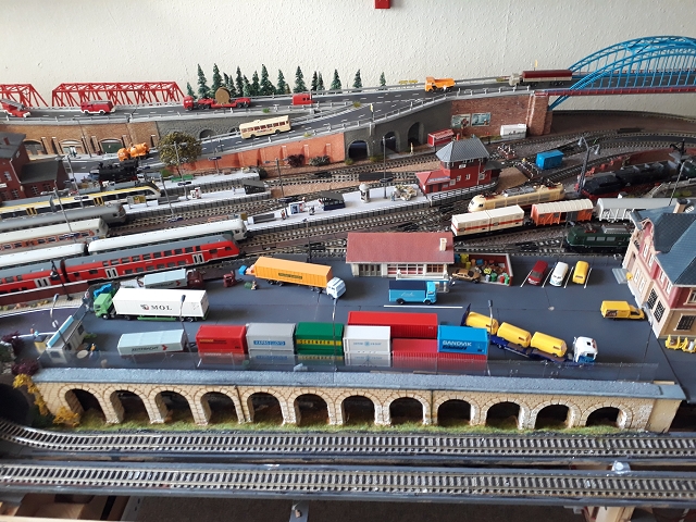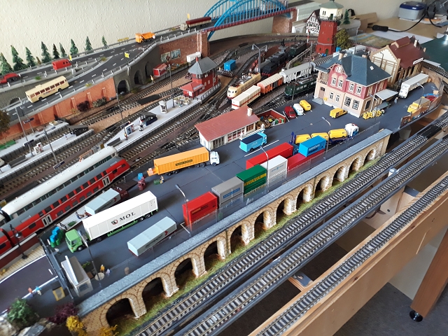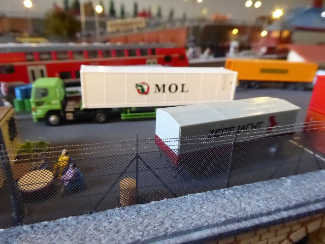 2 mm Forex-Platte. Die Forex-Platte habe ich Asphaltgrau grundiert. Die Gullydeckel eingeprägt und dann aufgeklebt. Asphaltnähte eingezeichnet. Außerdem wurden Abstellflächen für Container und Parkplätze mit einer 1 mm breiten weißen Klebefolie gekennzeichnet.