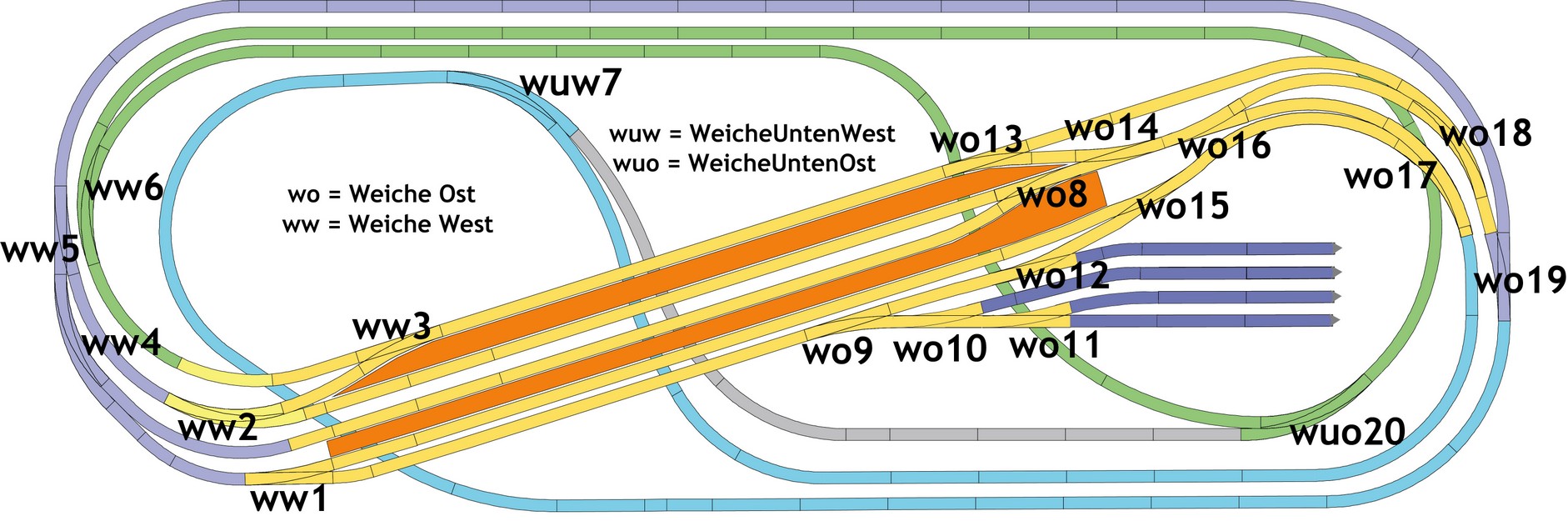 Je Modul kann ich 4 Weichen ansteuern. Wie auf dem Weichenplan zu sehen, habe ich die Weichen nach West- und Ostrichtung getrennt bezeichnet.